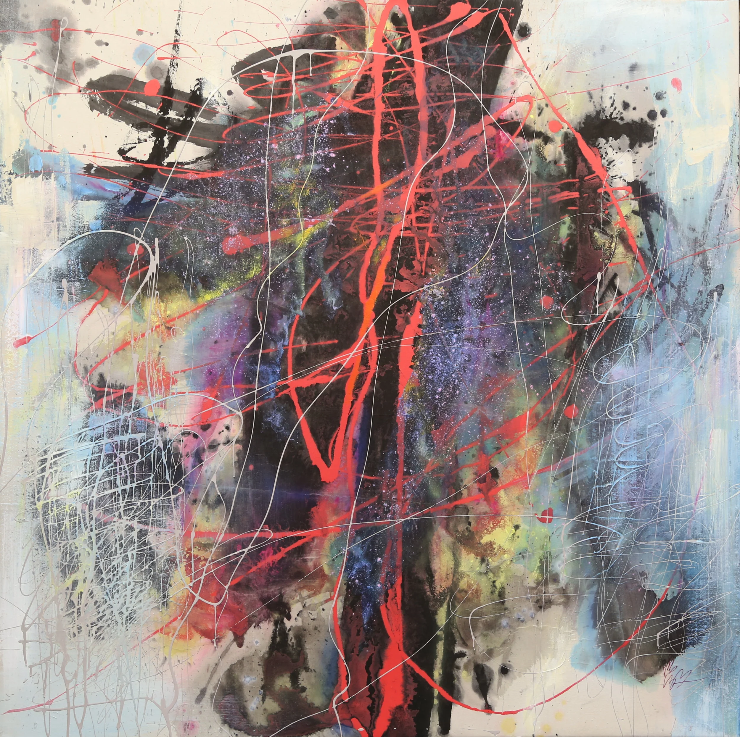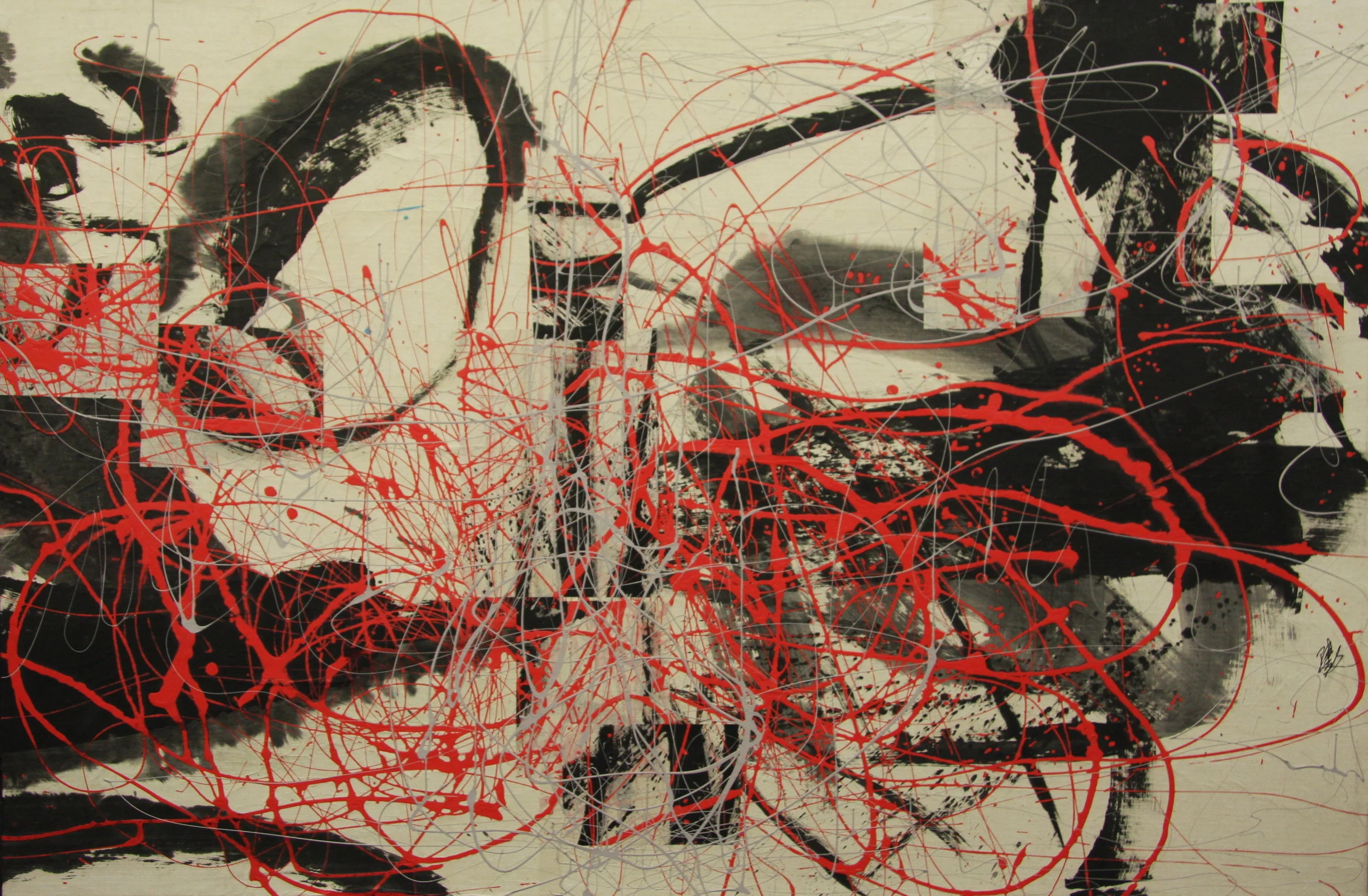 “從傳統繪畫精神取向和傳統的筆墨觀中鎮痛地分離出來”到墨韻與線條飄逸的自行遊走 —— 再次尋求一種新的墨象觀。建構一種新的繪畫圖式。 融匯了水墨與丙烯等繪畫顏料在兩度空間的平面上體現出時間感的節奏和韻律,以此承載內心情感的抒發,把智慧的視覺時間感悟化為空間感的存在”。其中可以看到傳統、現代表現技能的雙重構築與整合,詮釋新藝術超越東西方繪畫觀念古典的內涵。正所謂“縱使筆不筆,墨不墨,畫不畫,自有我在。(石濤語)中西文化在這裏碰撞,消解。不西不中,亦西亦中,筆由心動。呈現出中國當代彩墨創作在當下更廣泛的探索與研究的可能。
